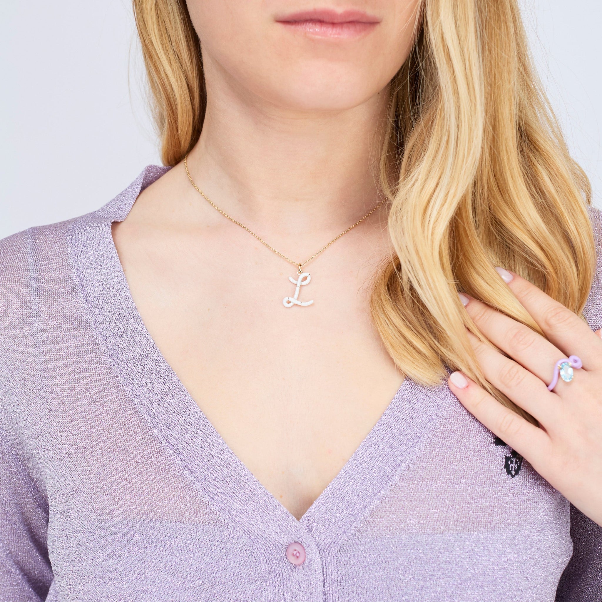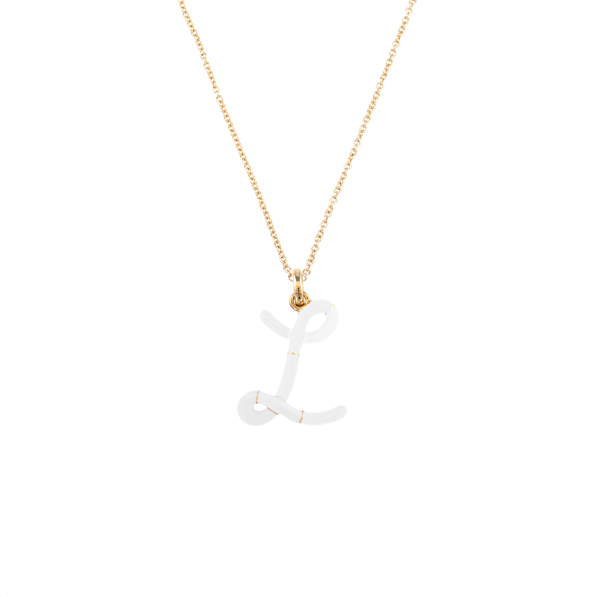 L Letter Necklace in 9kt yellow gold with white enamel.