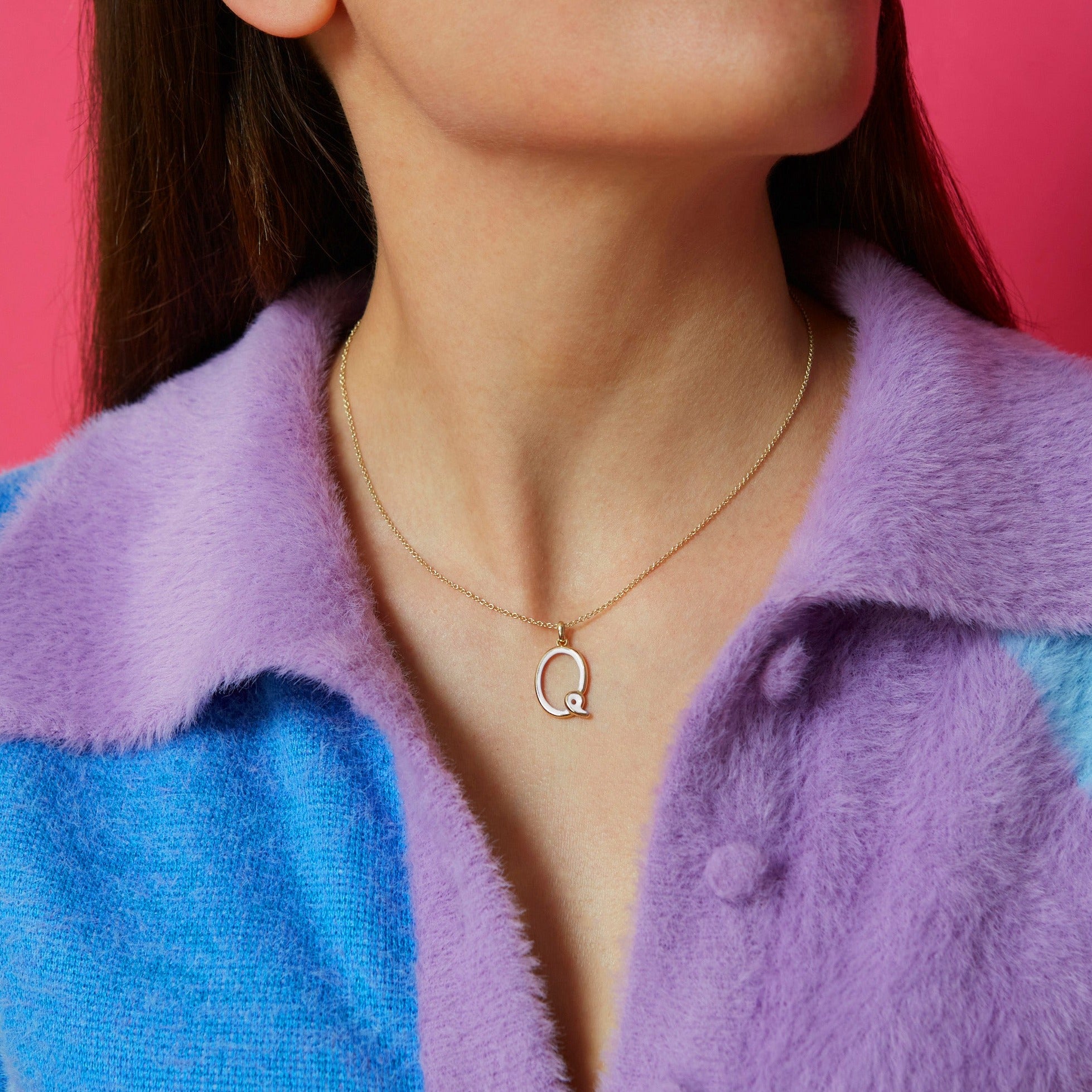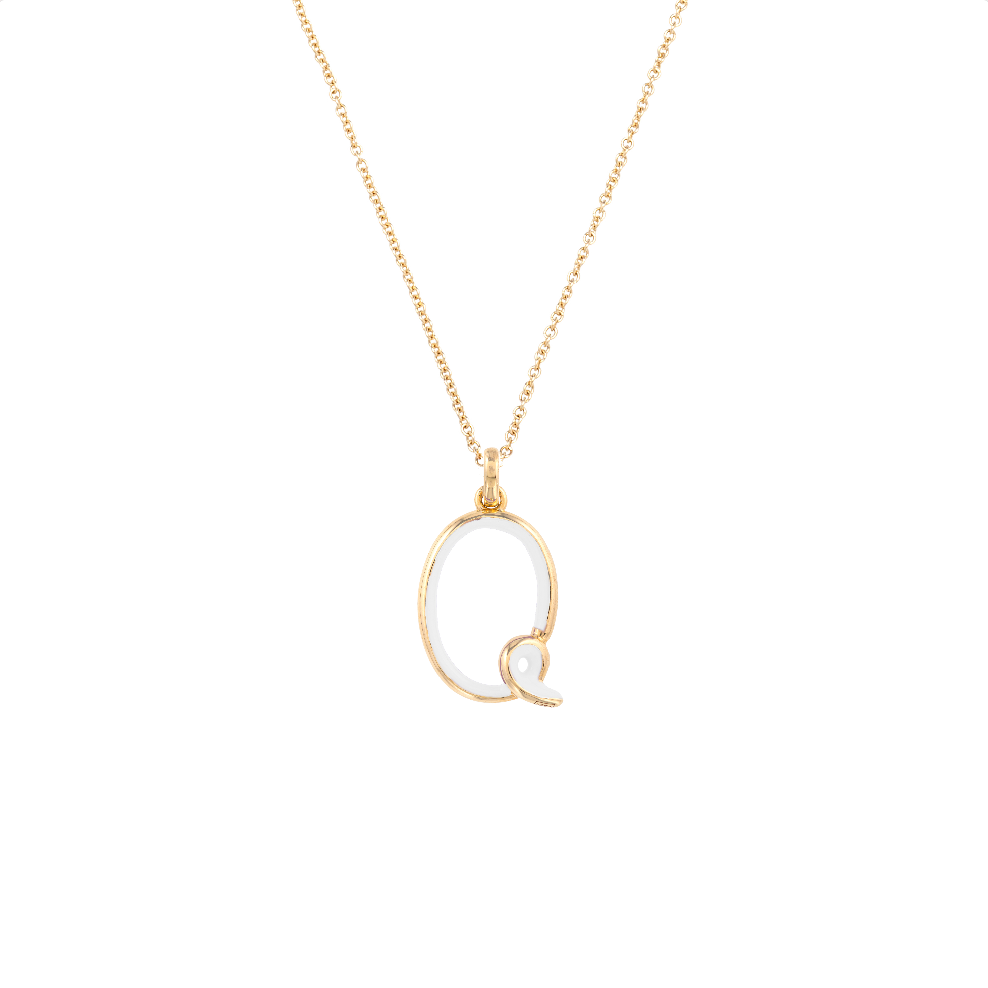Q Letter Necklace in 9kt yellow gold with white enamel.