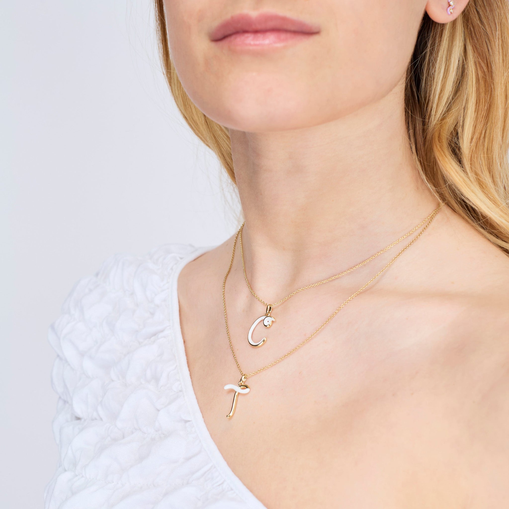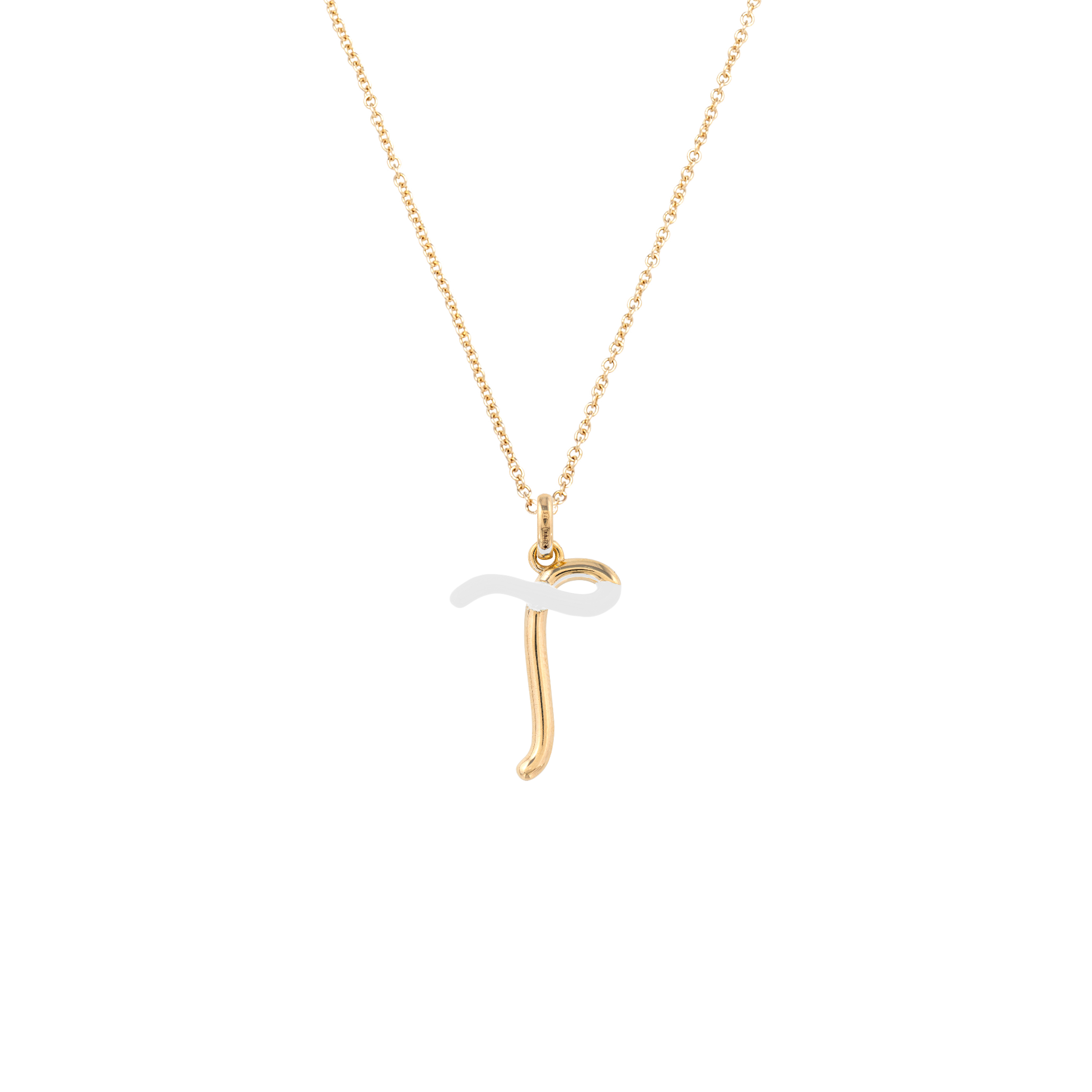 T Letter Necklace in 9kt yellow gold with white enamel.