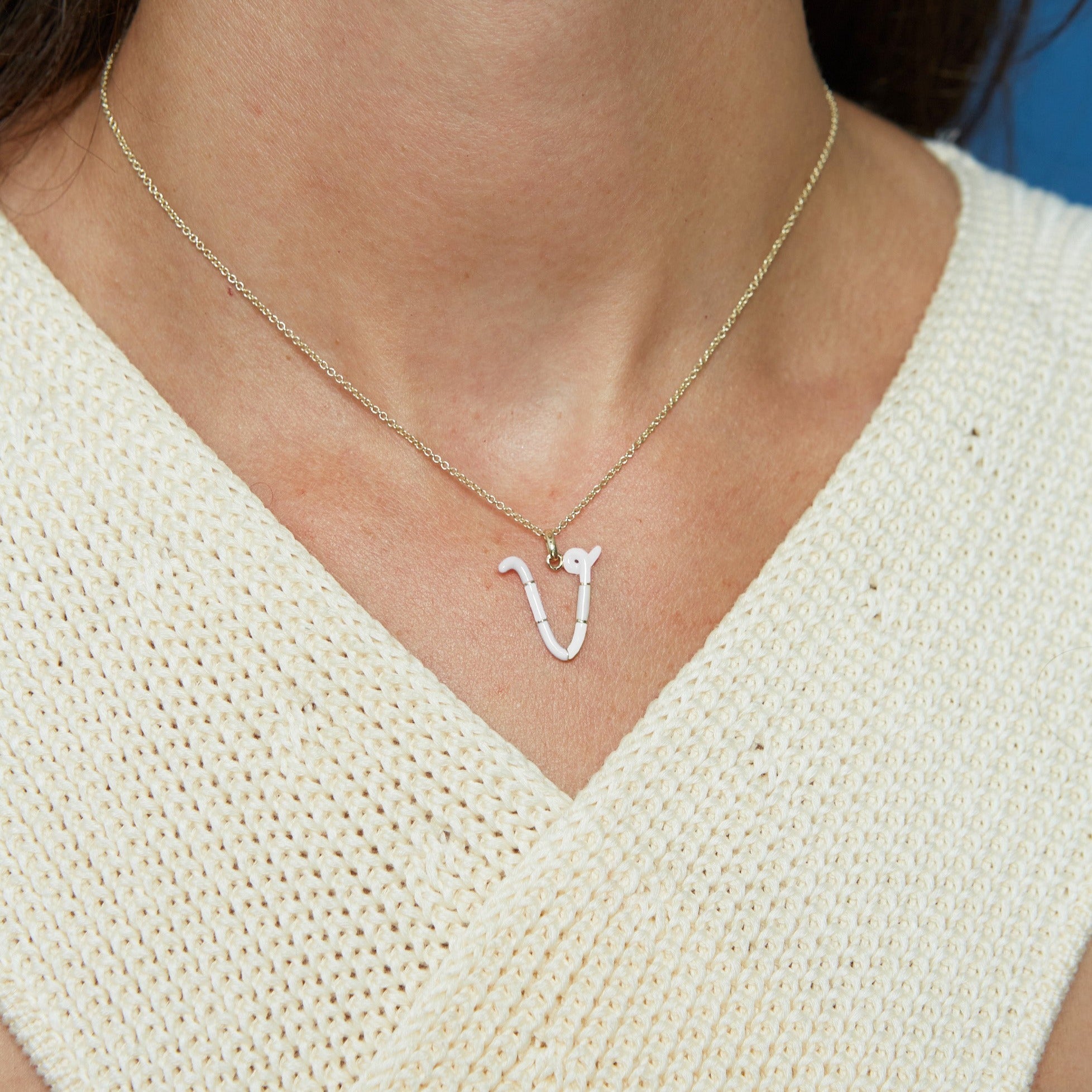 V Letter Necklace in 9kt yellow gold with white enamel.