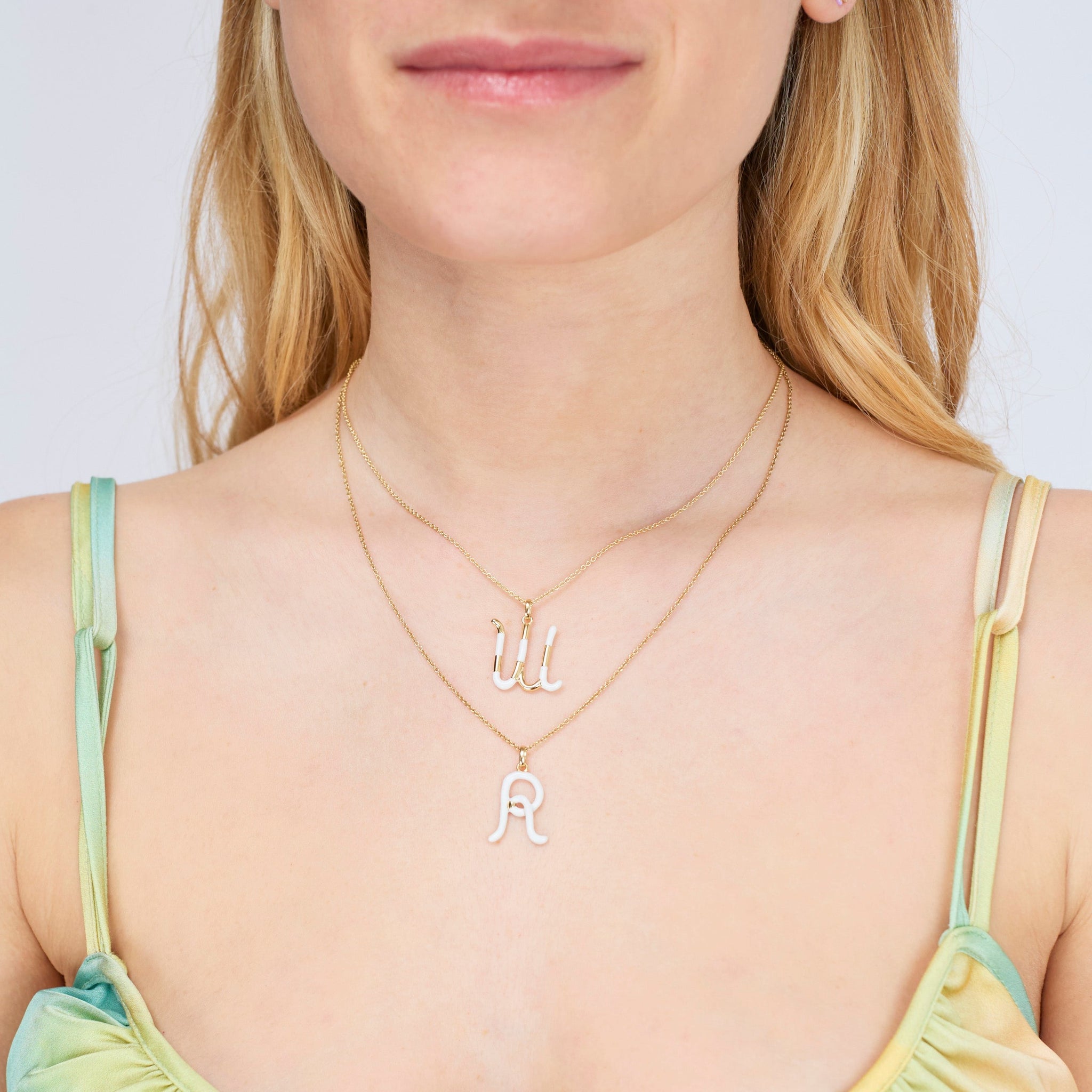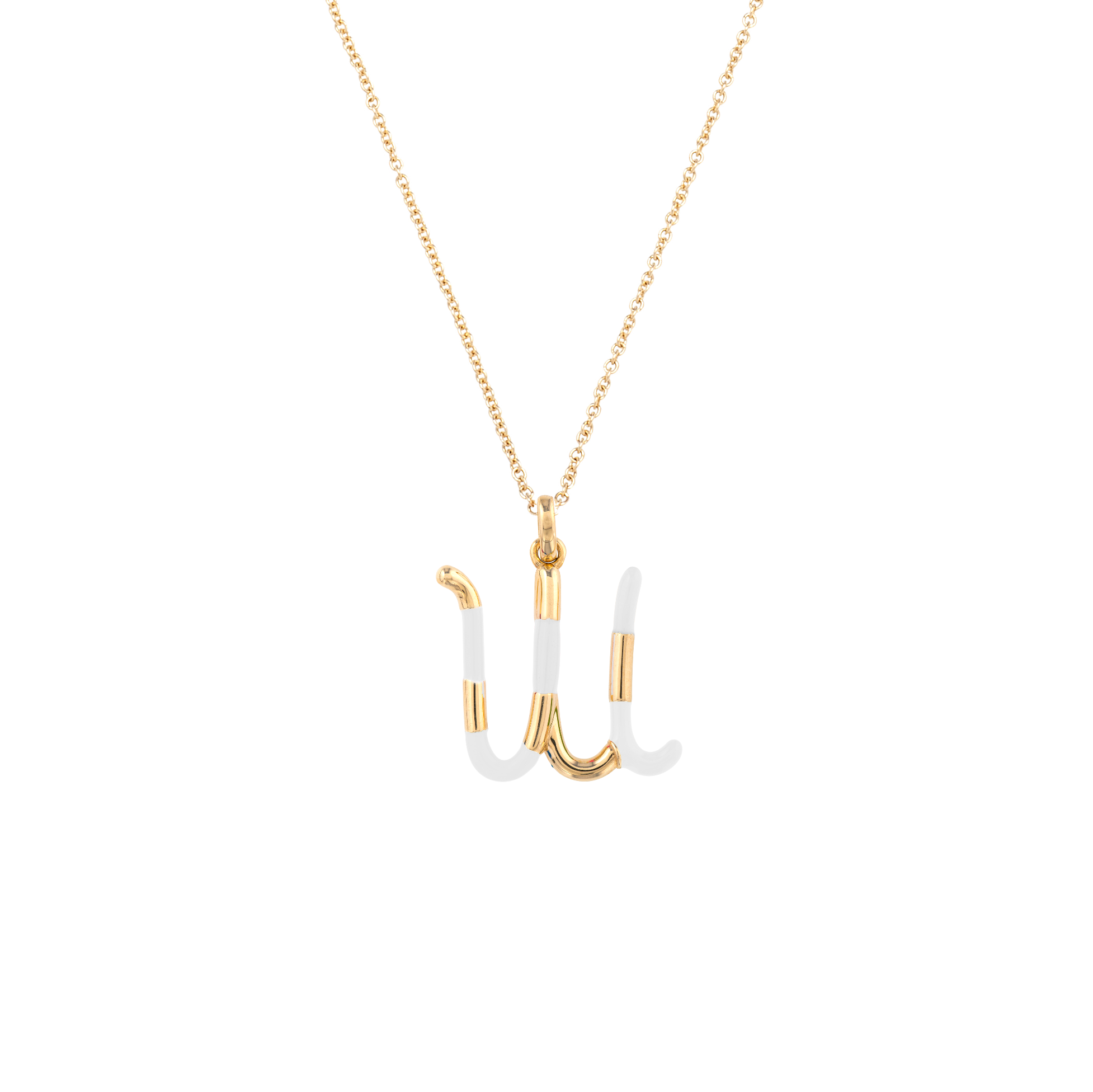 W Letter Necklace in 9kt yellow gold with white enamel.