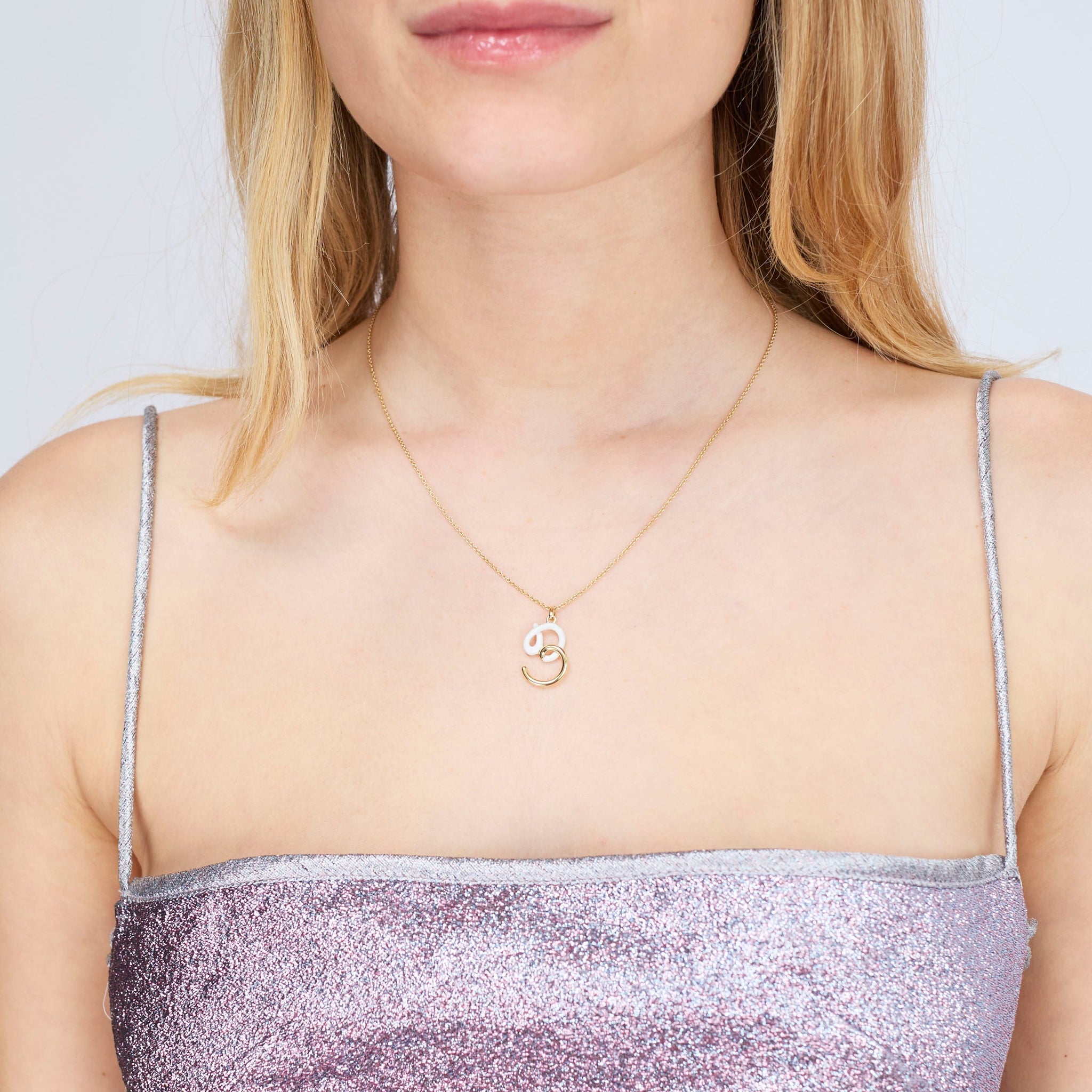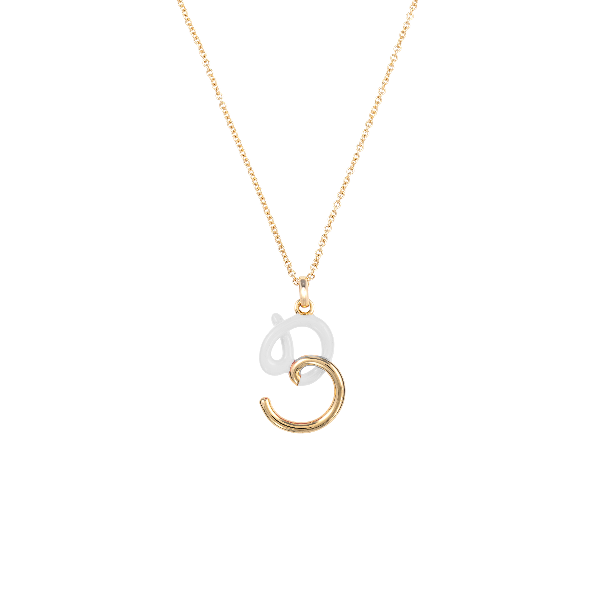 B Letter Necklace in 9kt yellow gold with white enamel.