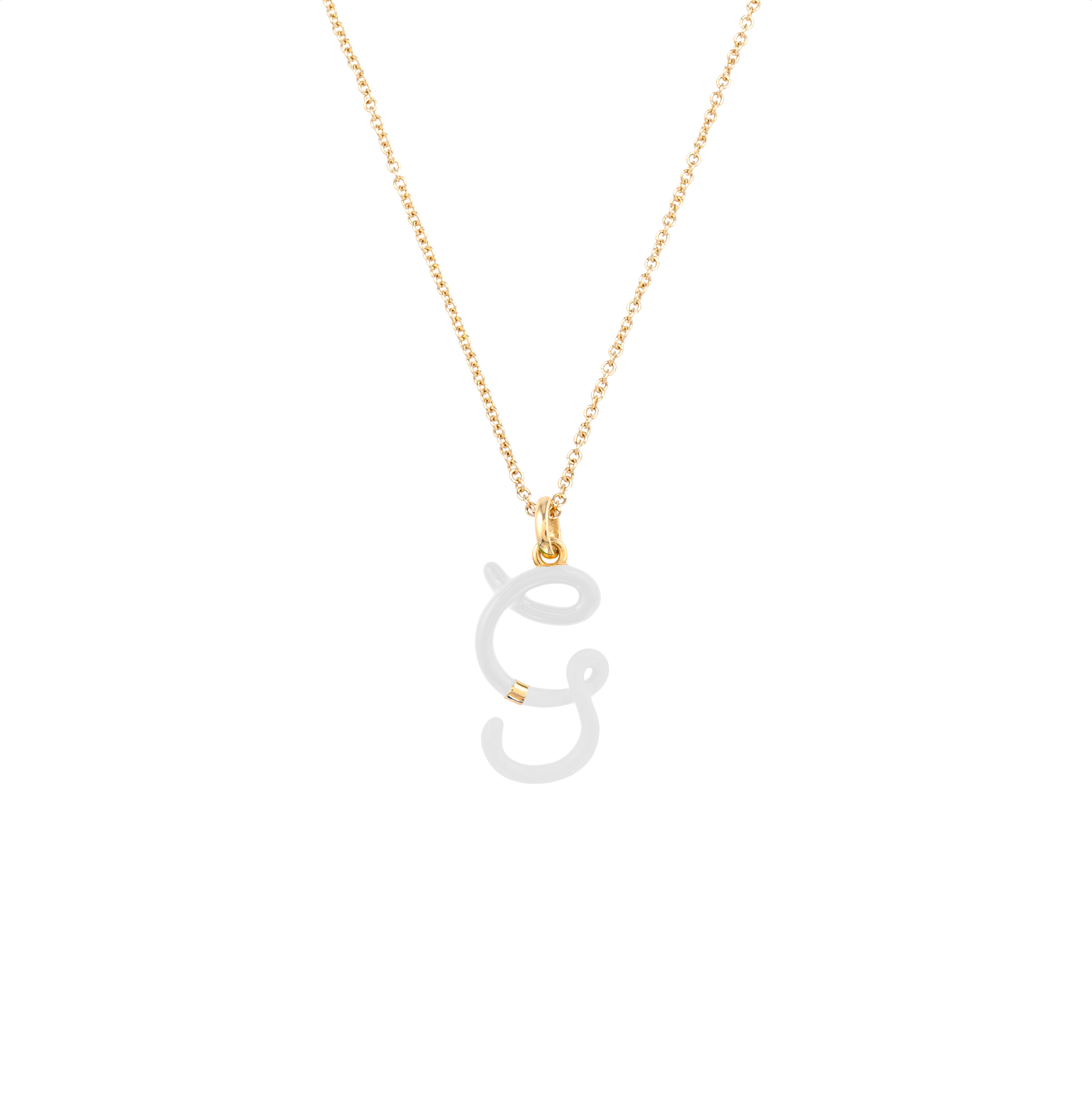 G Letter Necklace in 9kt yellow gold with white enamel.