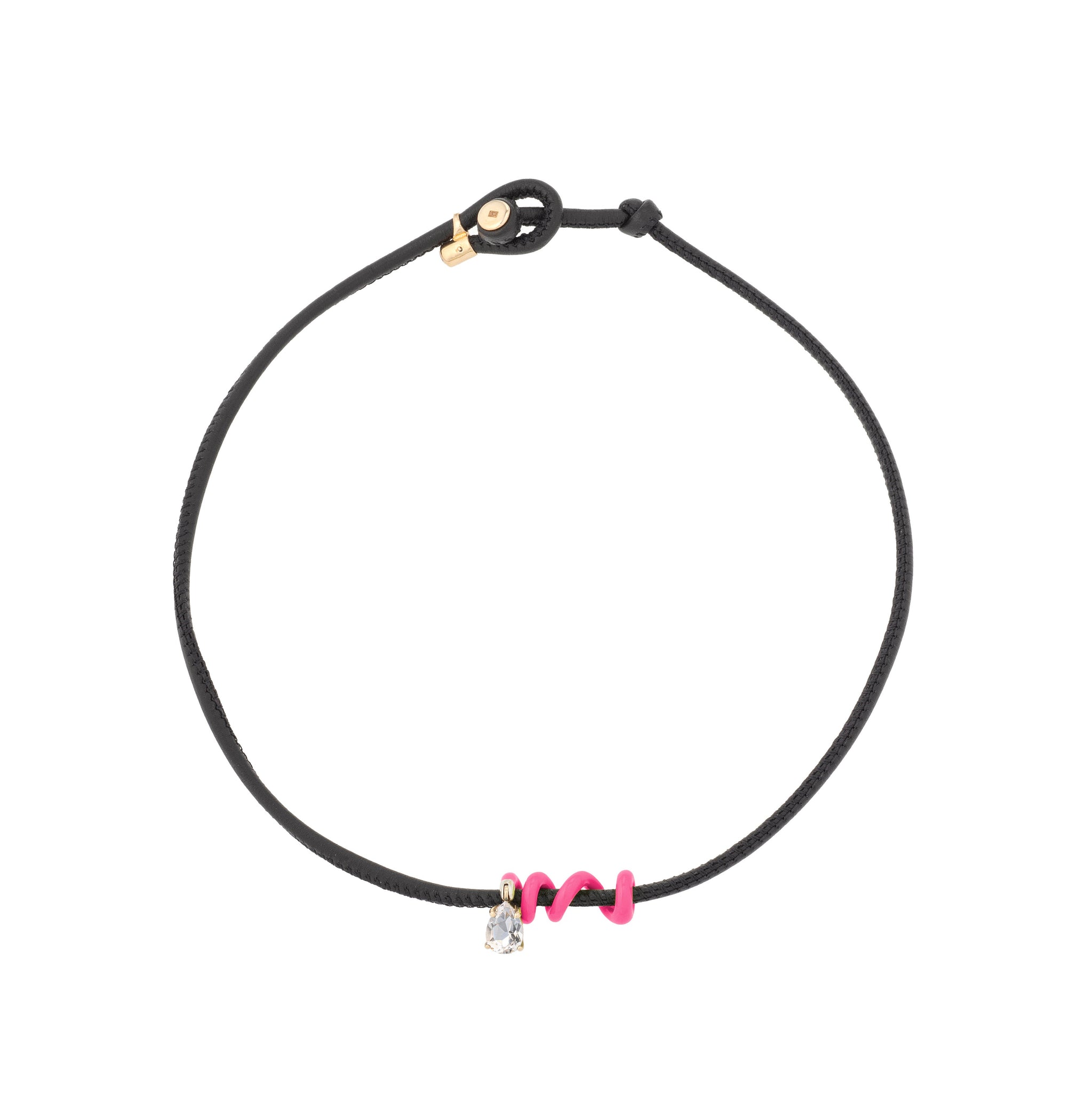 Vine choker necklace in gold and silver, featuring a azalea-pink vine curl on a black leather cord with a drop-cut rock crystal pendant.